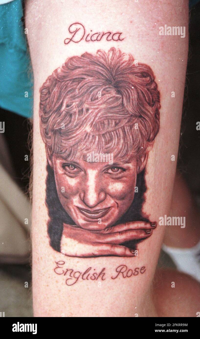 Das Tattoo Der Verstorbenen Prinzessin Diana Auf Clive Donalds Bein Clive Stammt Aus Paulsgrove Portsmouth Pic Mike Walker 1998 Stockfotografie Alamy